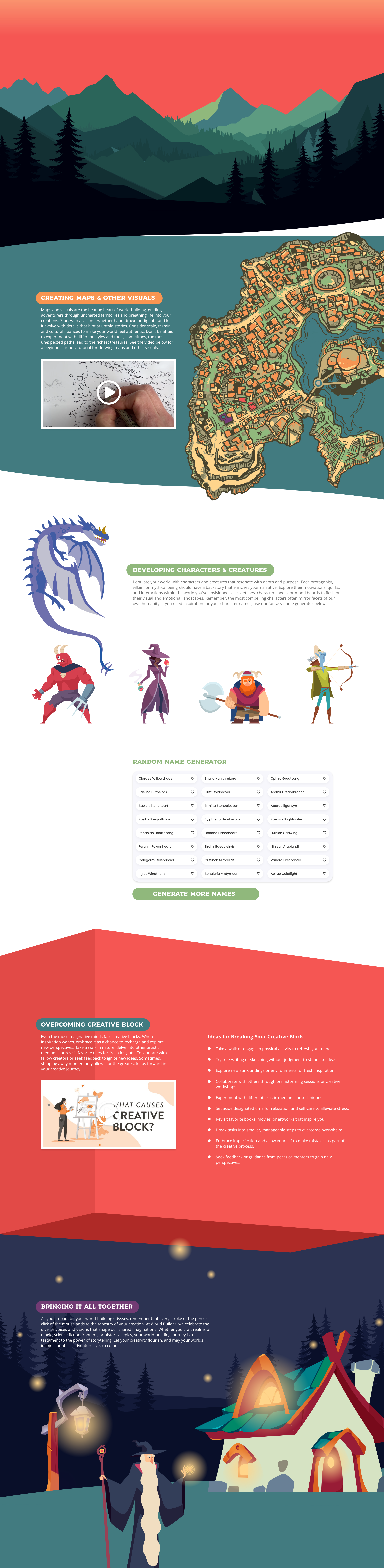 For this project, I was tasked with creating a UX Single-Page Scrollable Site project in Adobe XD. I chose to create a quick guide to fantasy world-building. This idea came about from my love of tabletop RPGs (role-playing games) such as Dungeons & Dragons. However, this idea could be used by authors, game programmers, or illustrators who may participate in world-building at any level. This site would be a place for step-by-step tutorials and idea generation to help with creative blocks when world-building. In dividing the sections of the site, these are the five main areas I focused on creating: